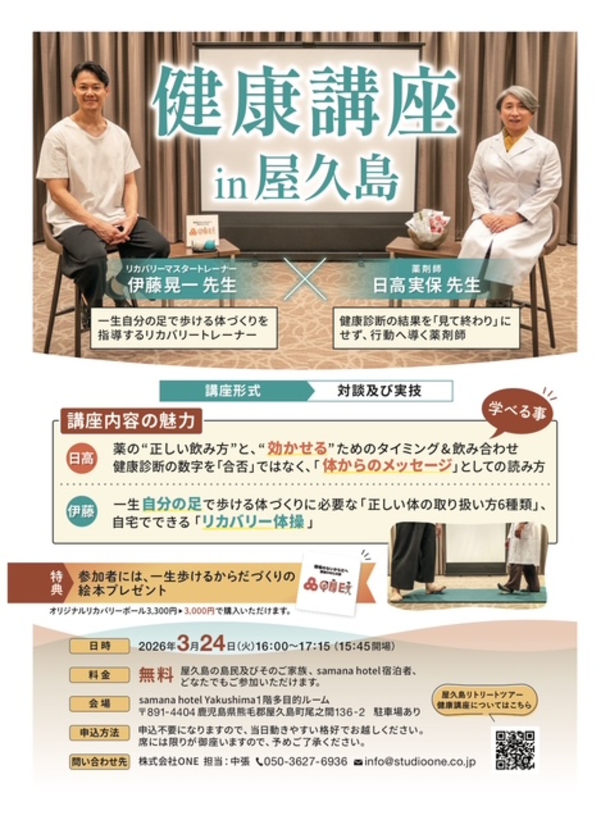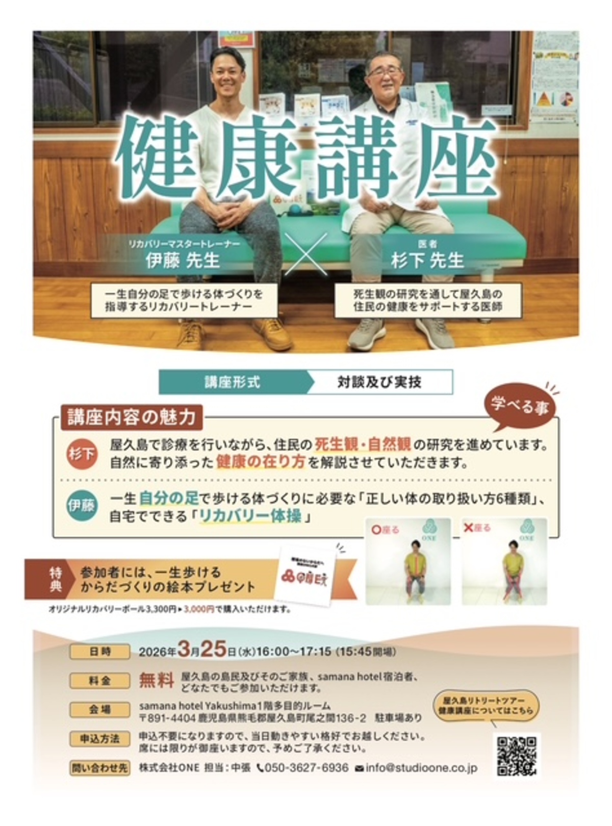 「健康講座」では、屋久在住の医師や薬剤師の方などスペシャリストをお招きし、健康に役立つ知識や考え方を学び、リカバリーマスタートレーナーの伊藤晃一からは、リカバリー体操や正しい体の使い方を体験しながら学んでいただく内容です。